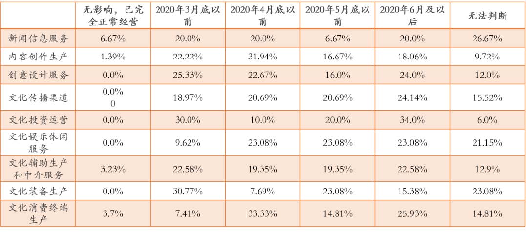 约79%的文化企业认为2020年3月底以前文化企业都不能恢复到正常营业状态;大约60%的文化企业认为在6月份之前可以正常恢复生产经营;23.72%的文化企业认为要在6月以后才能恢复。对于大多数文化企业来说,由于有几个月时间不能正常营业,2020年将会是非常艰难的一年。